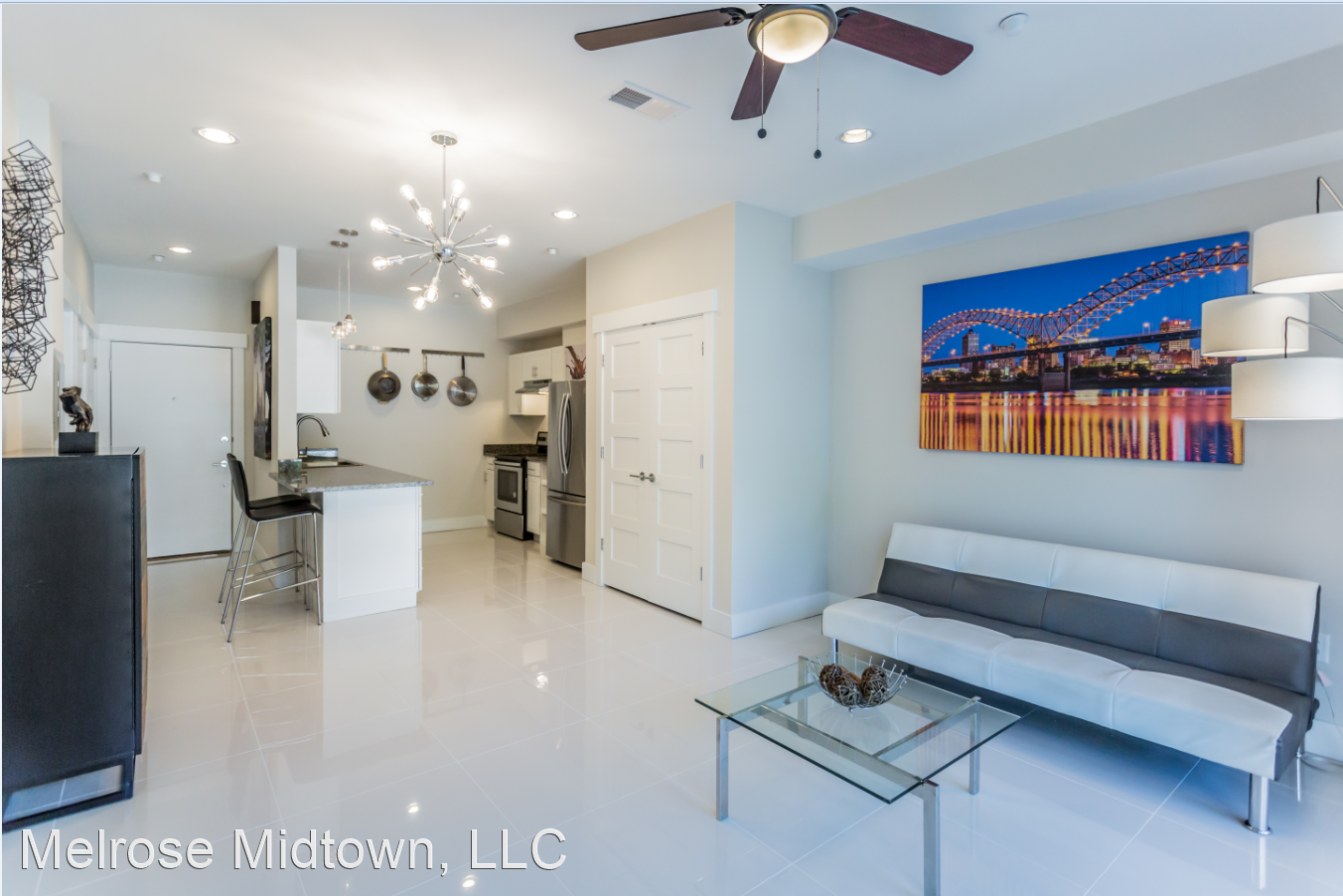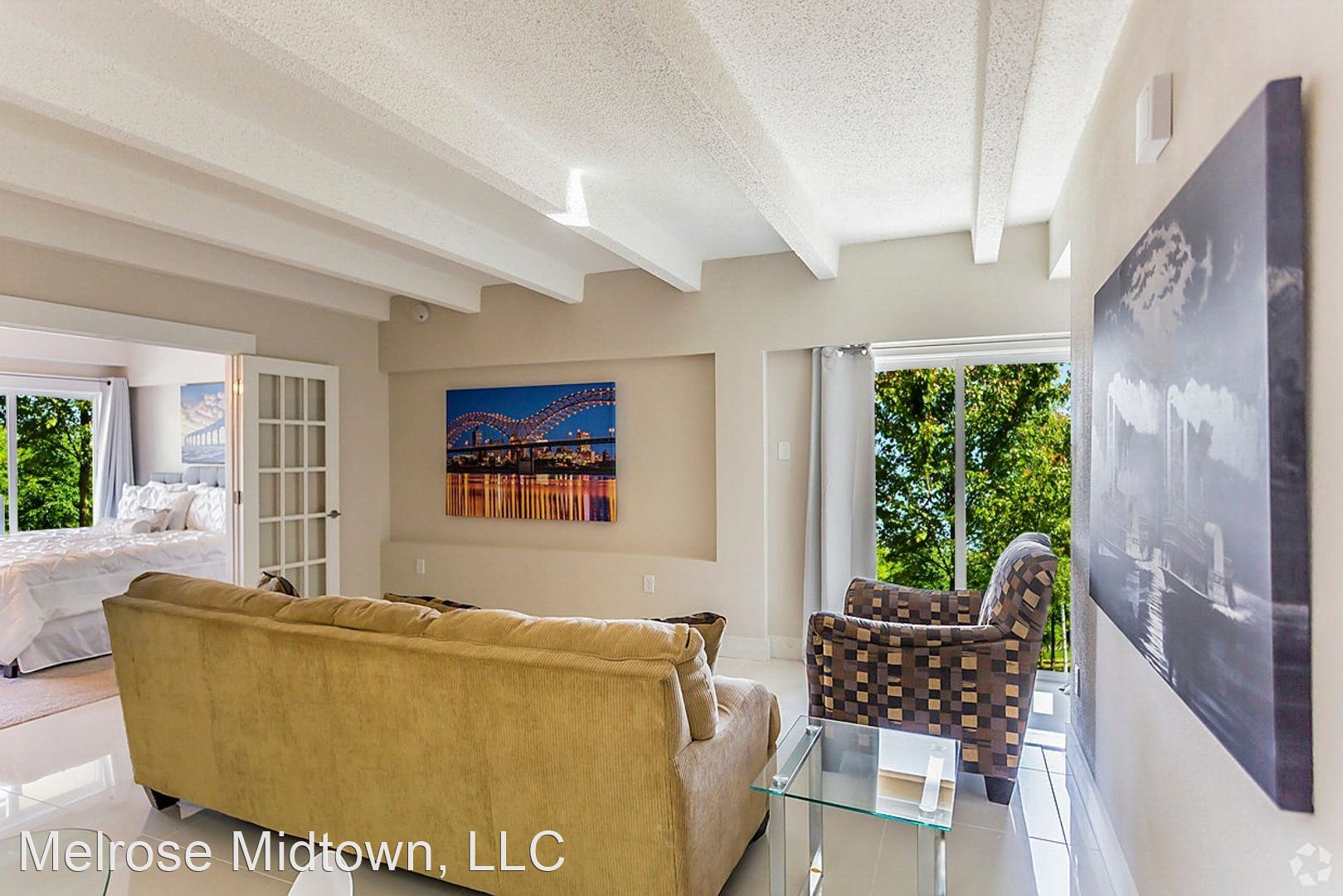 The Kira - Dine, play, and relax in the Kira's open floor plan. The Kira models, like all our apartments, were just renovated. They feature modern gleaming tile, marble bathrooms, lots of storage, and a large bedroom. A compact and complete kitchen offers granite countertops, stainless appliances, dishwasher, disposal, washer and dryer. The Kira also features a pass-through window between kitchen and dining area or a kitchen island. Some even have walk in closets. Unusual for its size, the Kira's bedroom has an “en suite” full bath: tub, commode, vanity, vanity mirror, and large closet. New ceiling fans, new flooring, and sparkling clean finishes keep your space cozy and fresh day or night. All Kira (South) apartments offer large windows and streaming sunlight year-round. For extra convenience, all Kira units are just a few steps from the building elevators. Are you ready to move? We're ready to meet you! The Melrose won the 2019-2022 award for Best Apartment Community in all of Memphis. Take a tour today and find out why. Prices are higher on the north side of the Melrose and on higher floors (including penthouse).